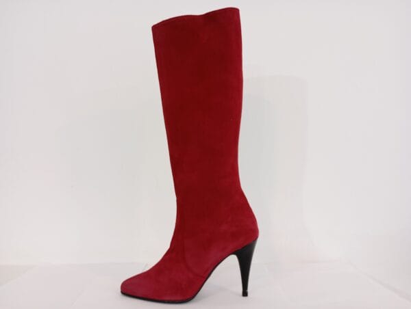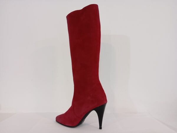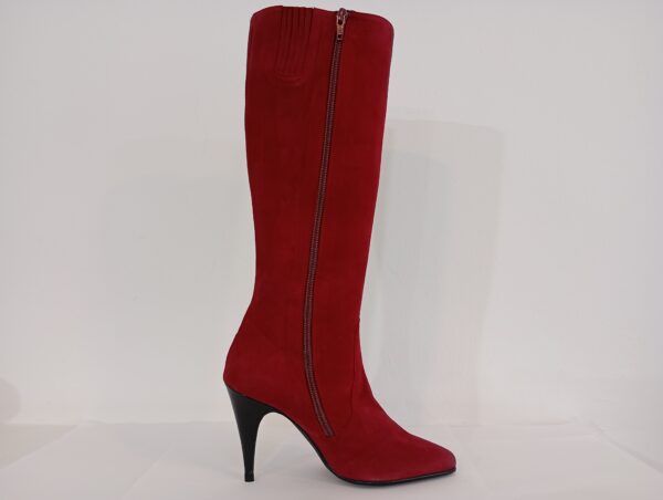 BOTA ALTA DE CREMALLERA DE ANTE ROJO CON TACON EN MATERIAL BRILLO ROJO .