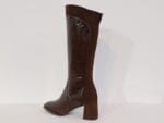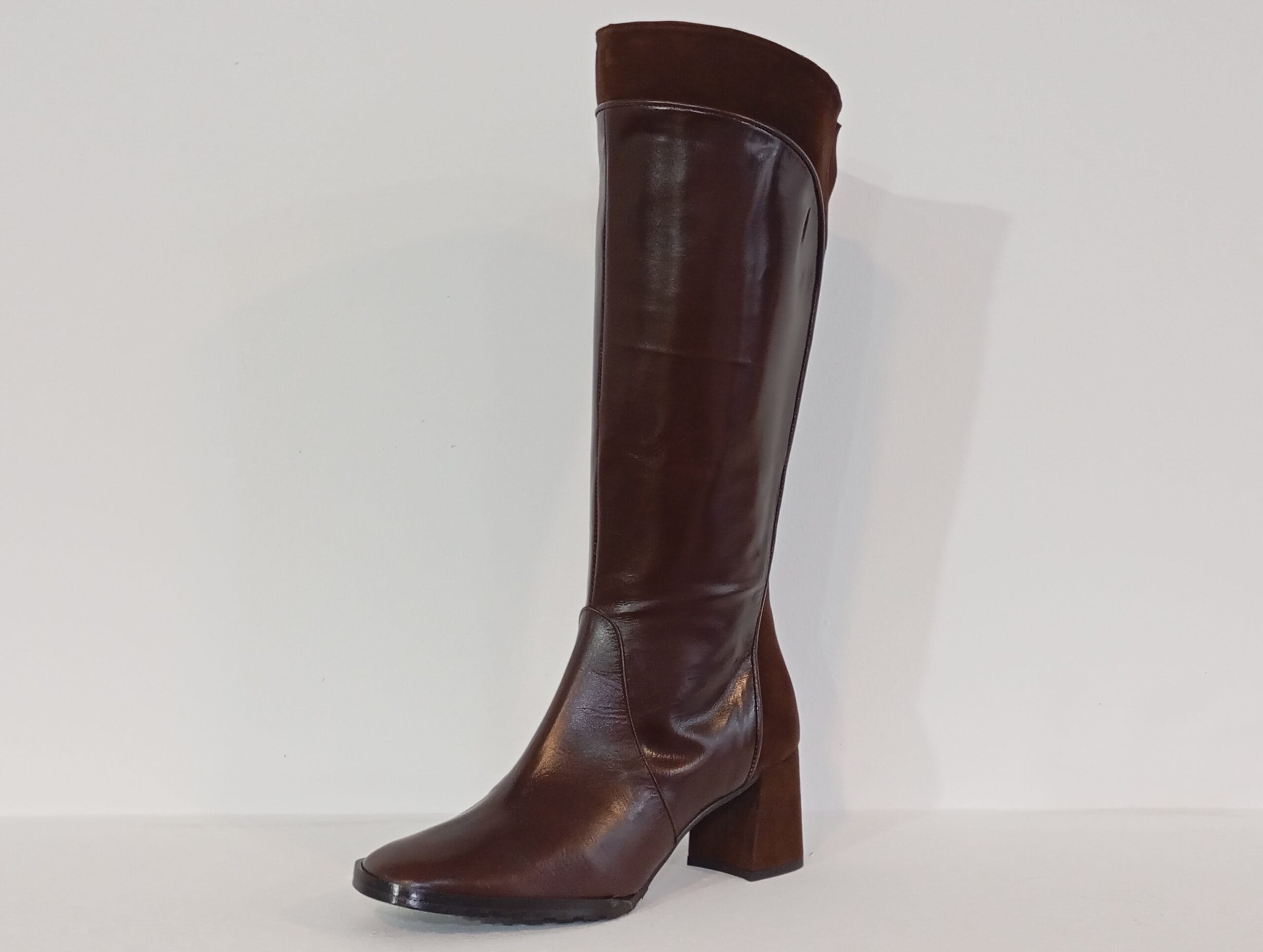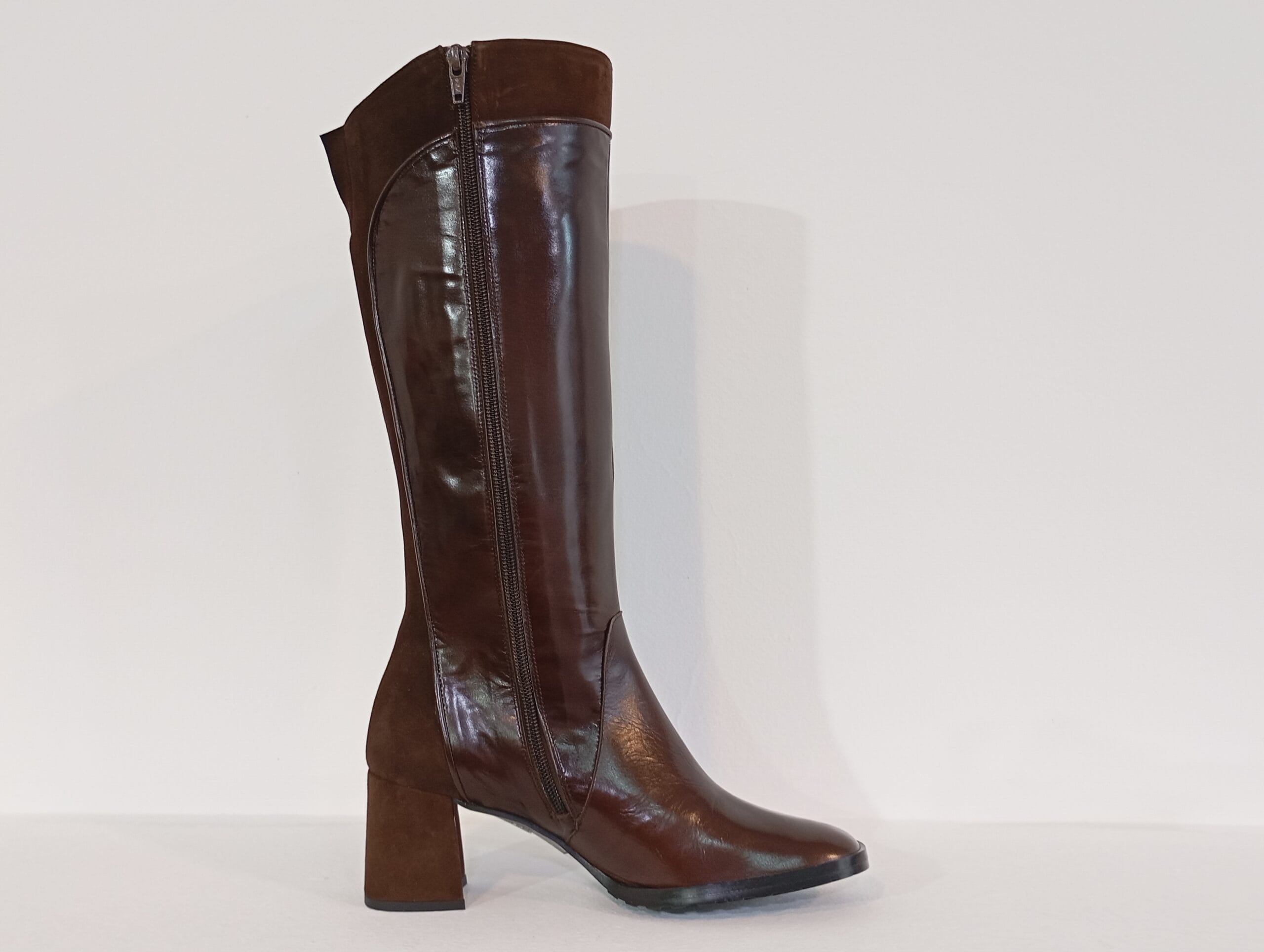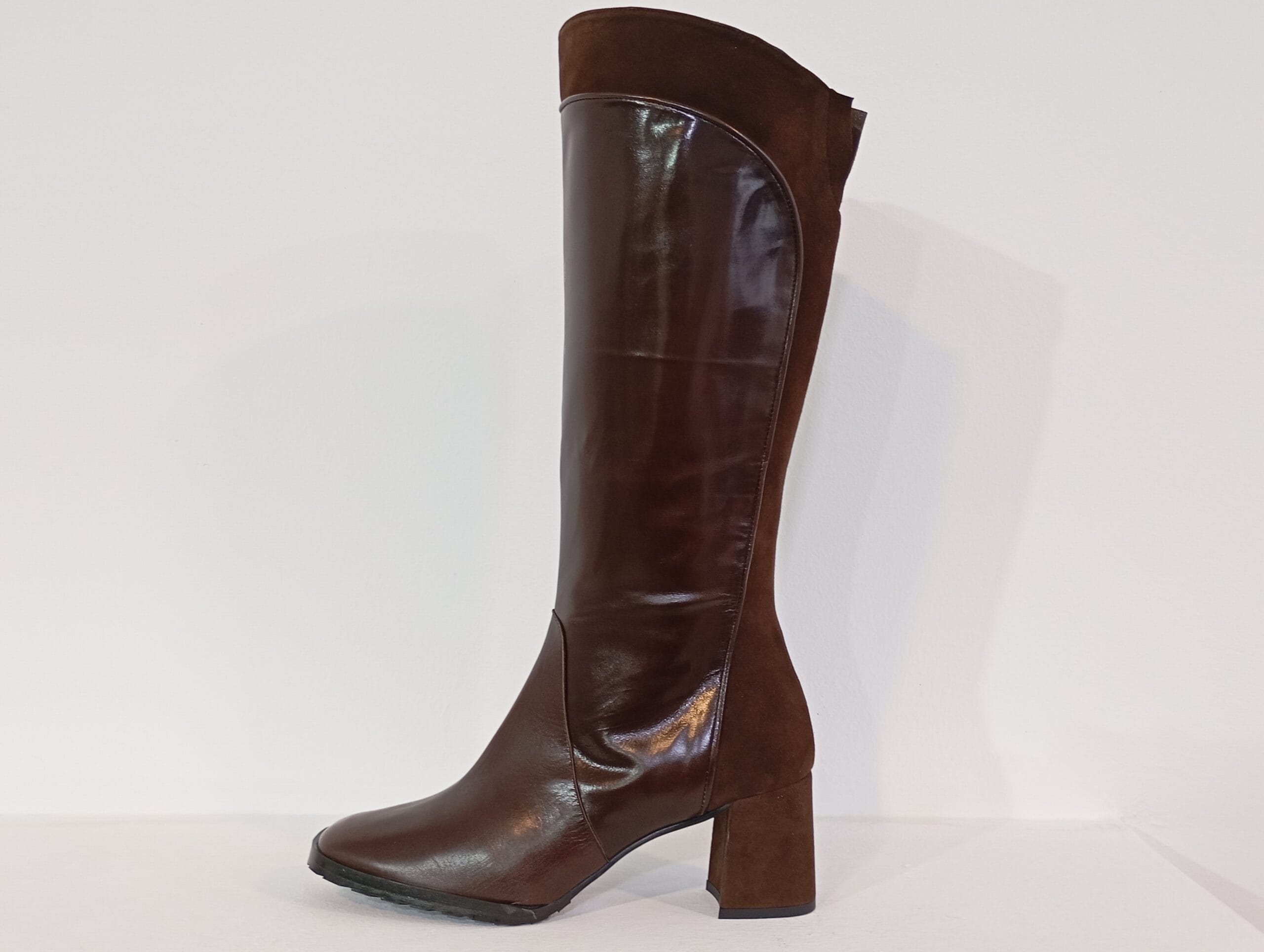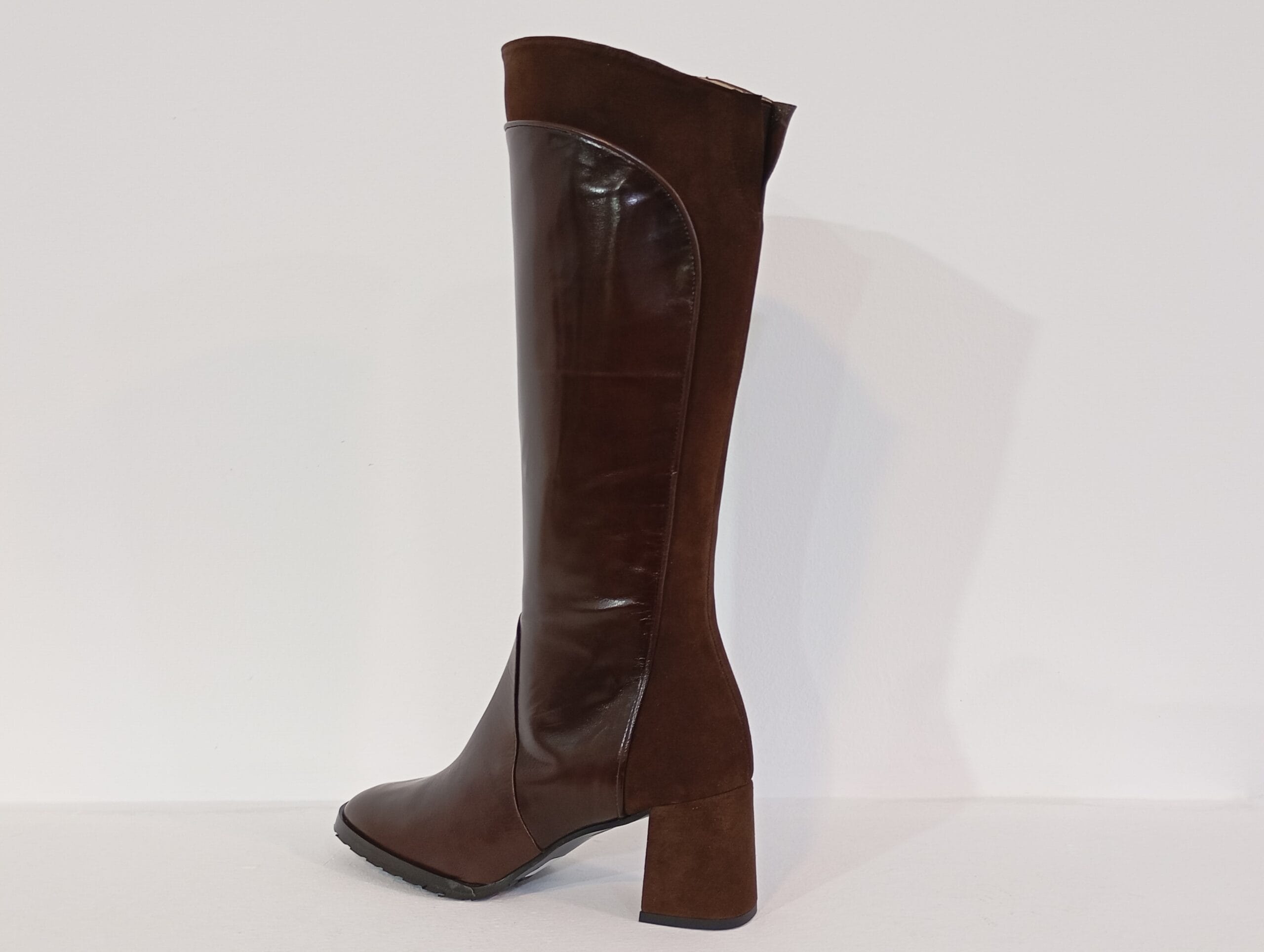 BOTA ALTA CON CREMALLERA EN PIEL MARRONCON ADORNO EN LA PARTE DE ATRAS EN ANTE MARRON AL TONO CON TACON CUBANO Y CERCO EN LA SUELA PARA LA PISADA.