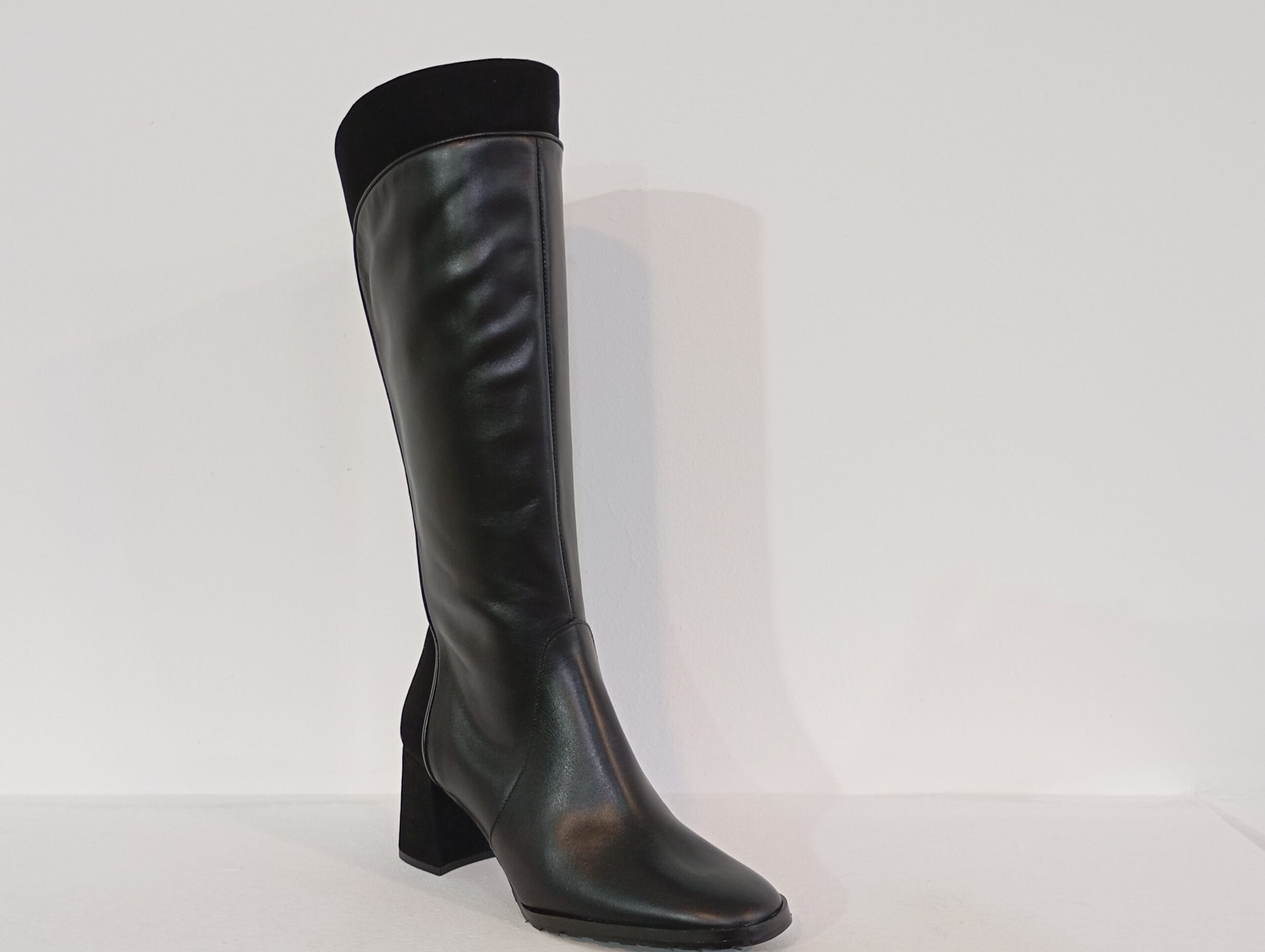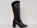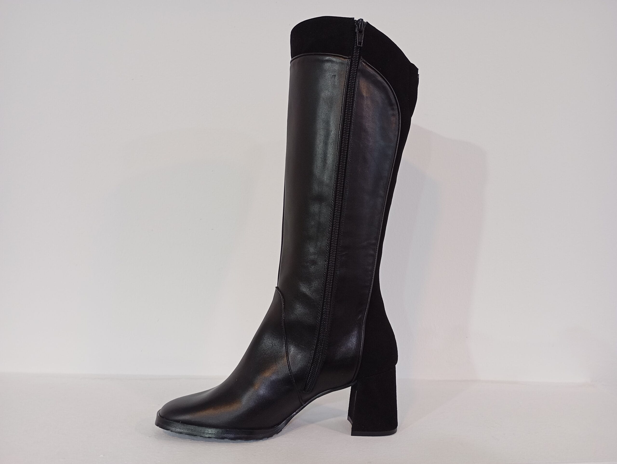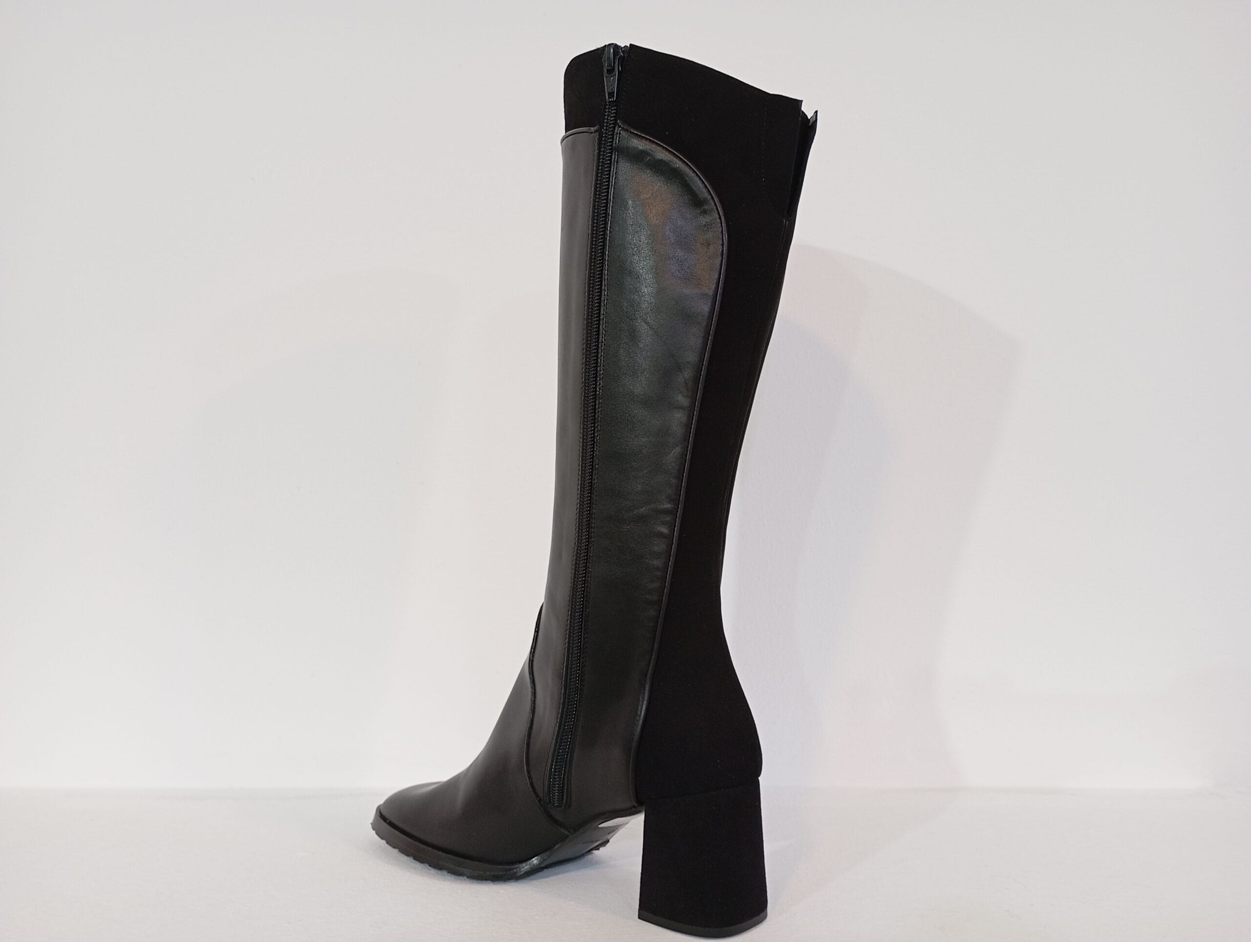 BOTA ALTA CON CREMALLERA EN PIEL NEGRA CON ADORNO EN LA PARTE DE ATRAS EN ANTE NEGRO AL TONO CON TACON CUBANO Y CERCO EN LA SUELA PARA LA PISADA.