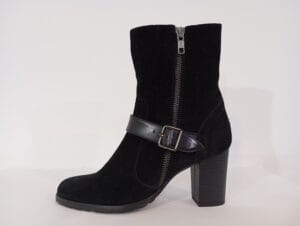 BOTIN CON ABERTURA CENTRAL CON ADORNO DE HEBILLAS EN ANTE NEGRO CON TACON ALTO.