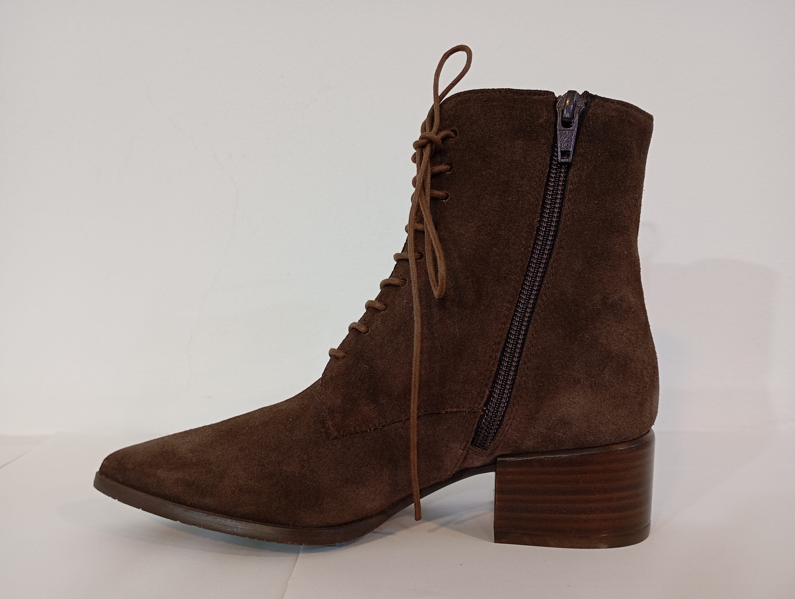 BOTIN ACORDONADO CON CREMALLERA LATERTAL EN SERRAJE MARRON CHOCOLATE CON TACON CUBANO BAJO.