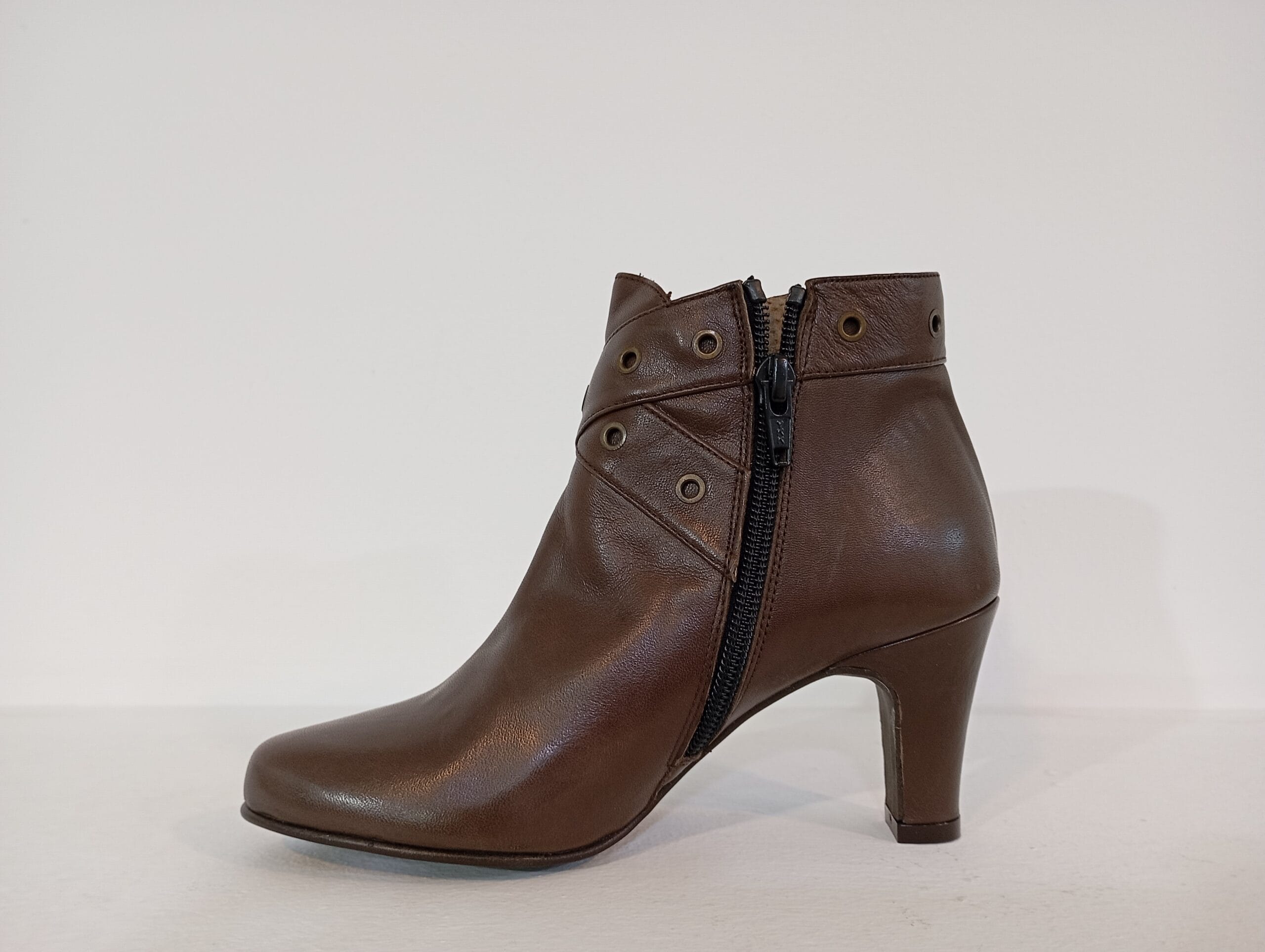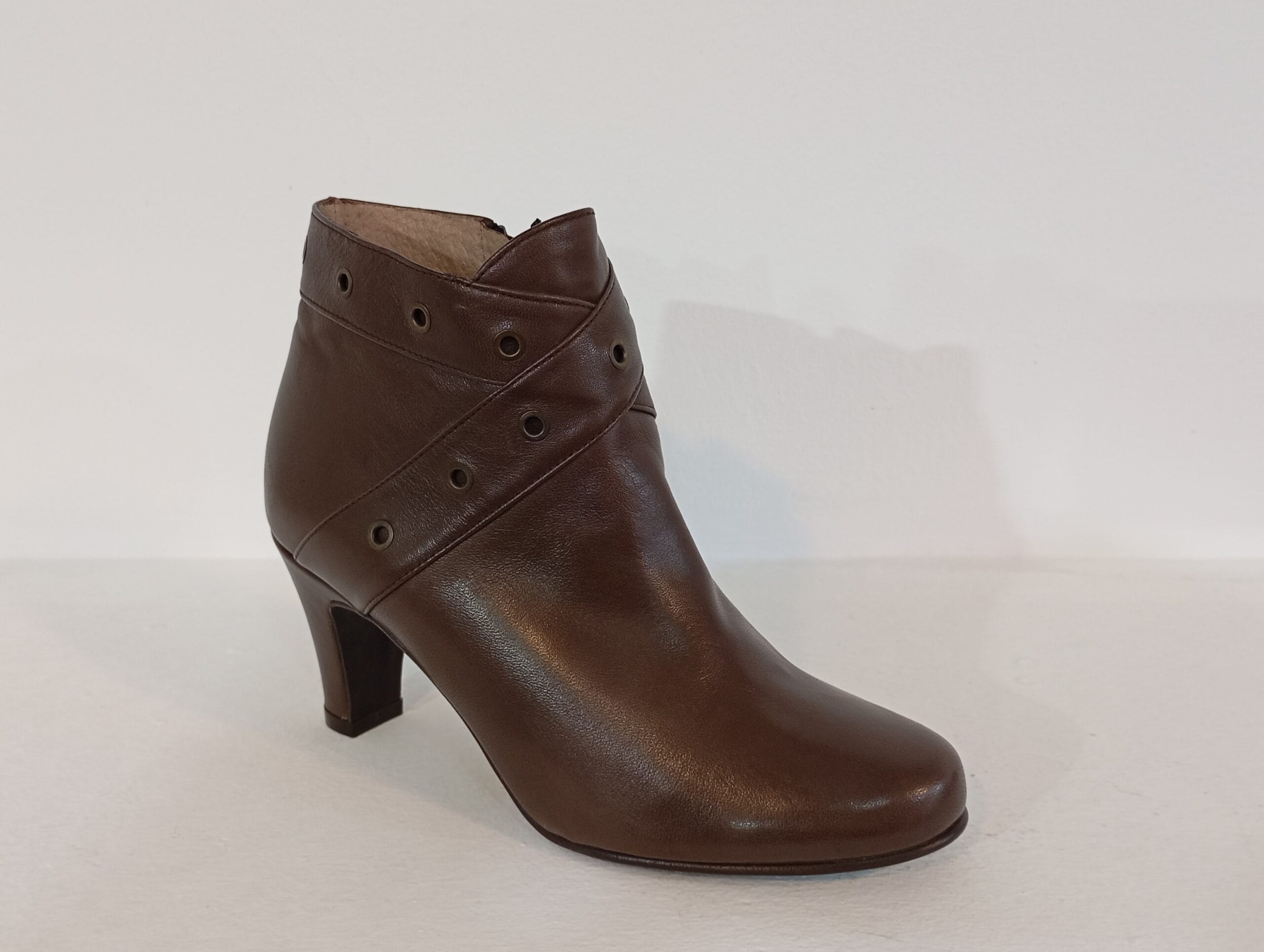 BOTIN EN PIEL MARRON CHOCOLATE CON ADORNO DE TACHUELAS Y TACON MEDIO .