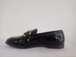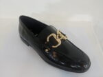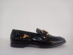 MOCASIN PLANO CHAROL NEGRO CON ADORNO DE HEBILLAS DORADAS.