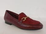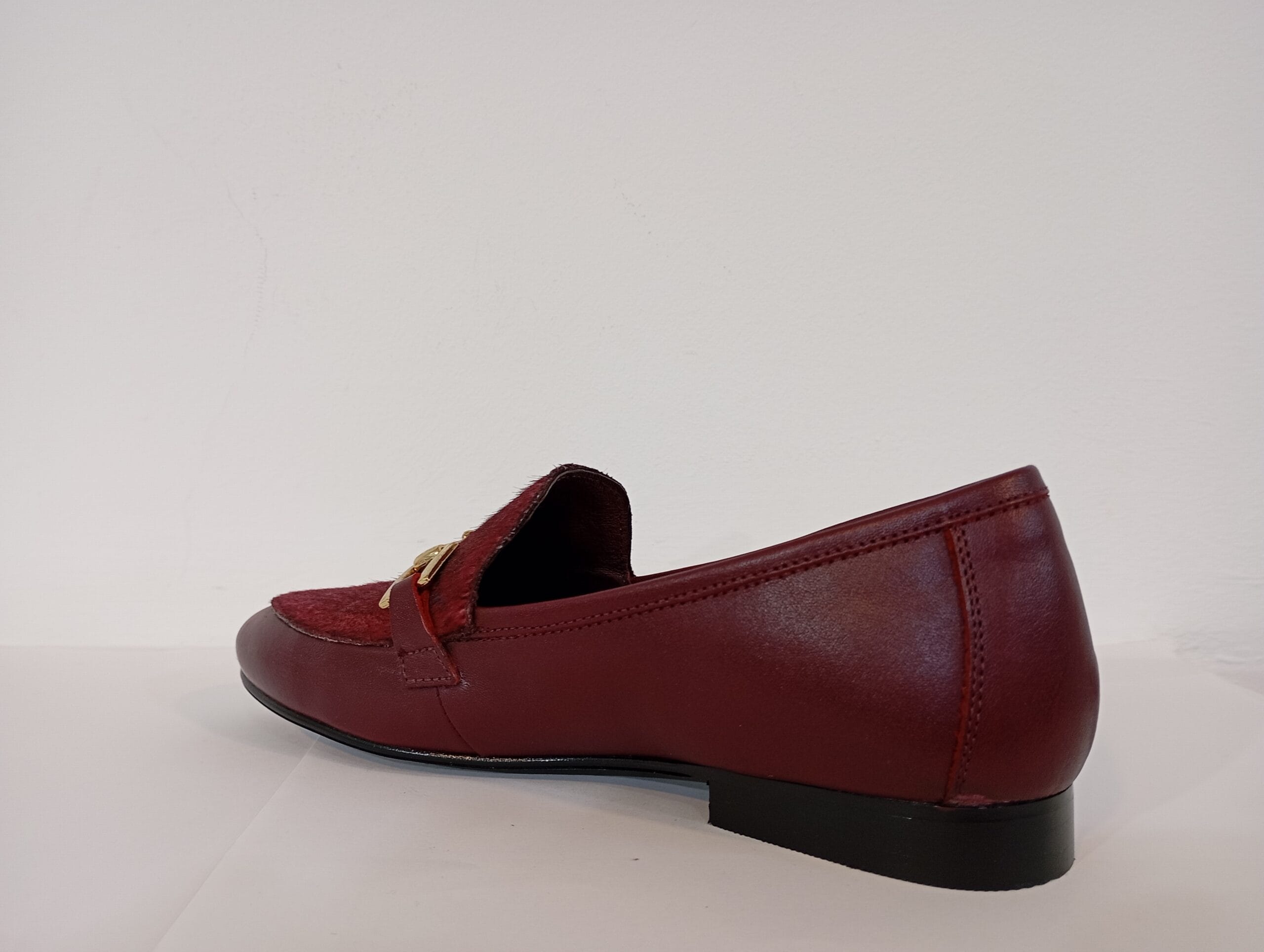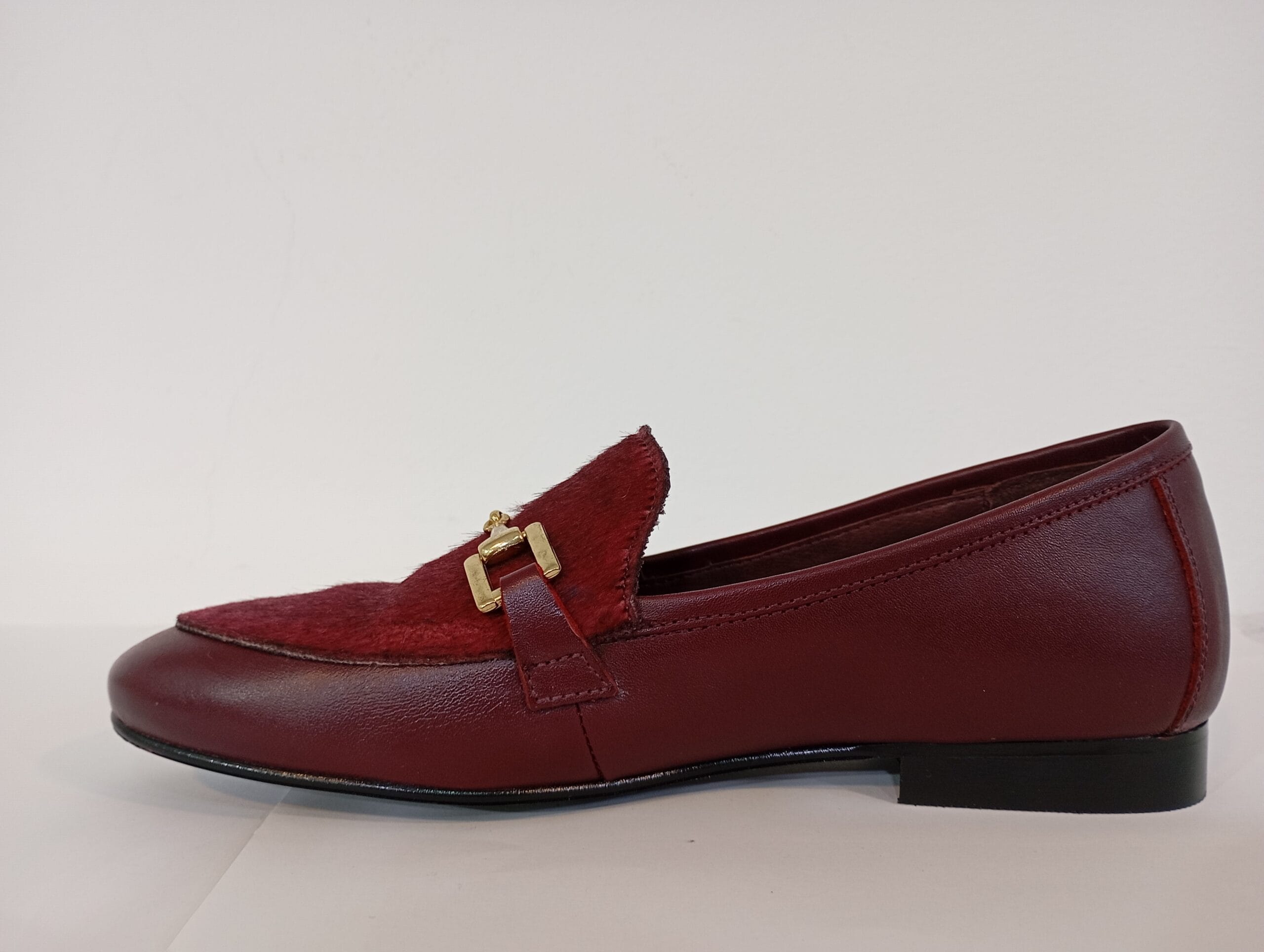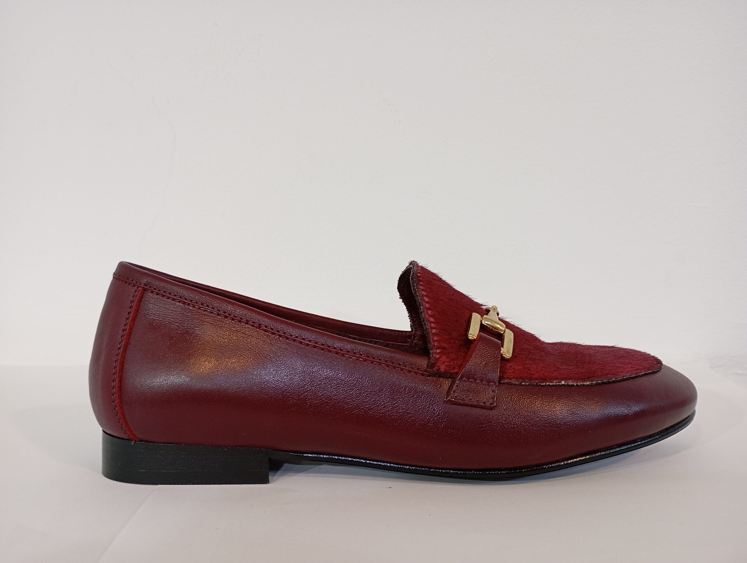 MOCASIN PLANO EN PIEL BURDEOS CON SOLAPA EN PELO BURDEOS Y HEBILLA DORADA .