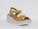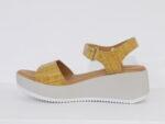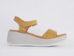 SANDALIA DE PIEL CAMEL GRABADA CON CUÑA DE GOMA, CIERRE DE VELCRO