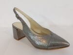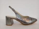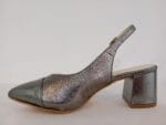 ZAPATO SALON DE PUNTA FINA DESTALONADO CON TACON CUBANO,EN METAL PLATA VIEJA , HORMA ANCHA.