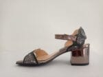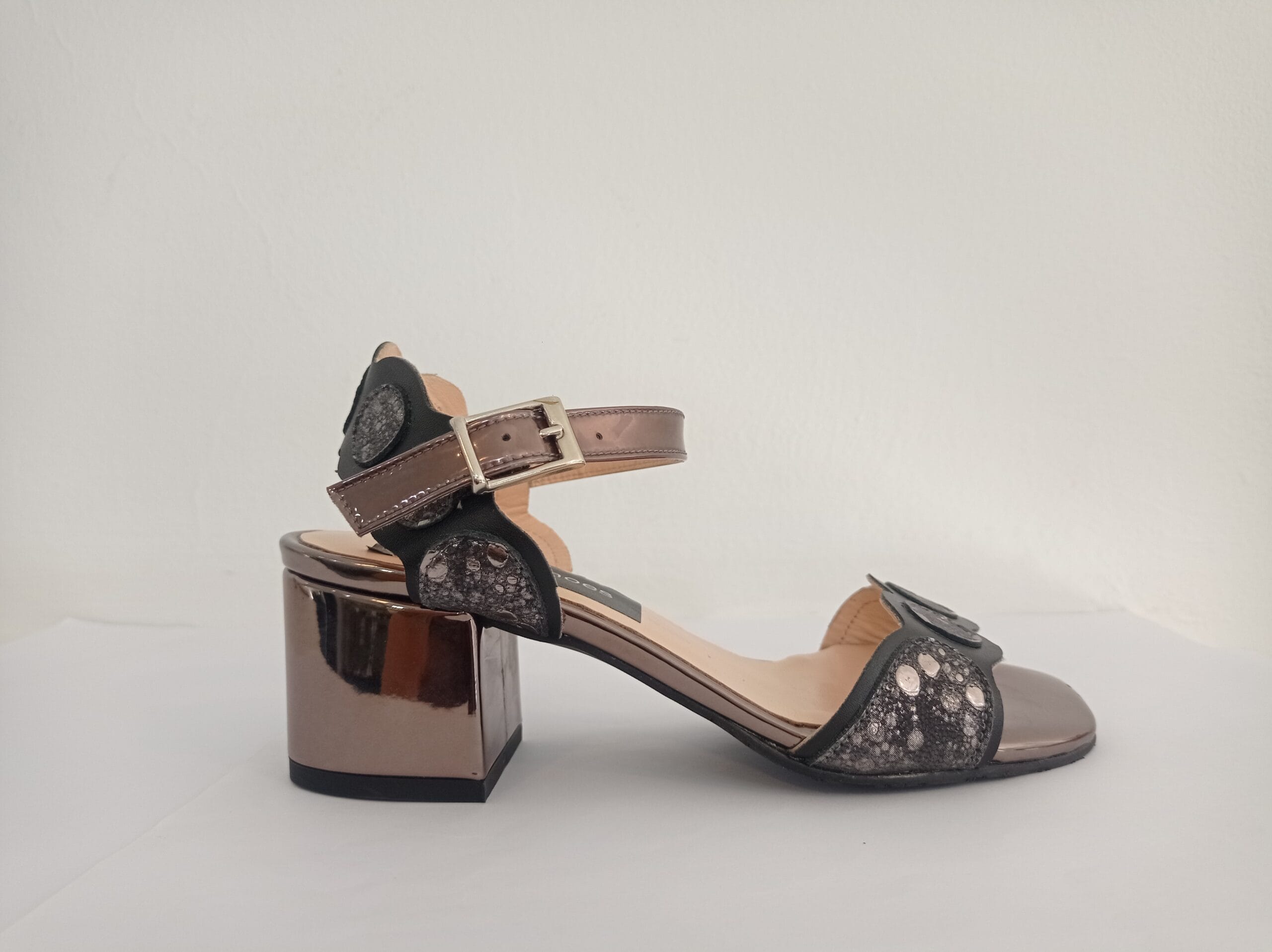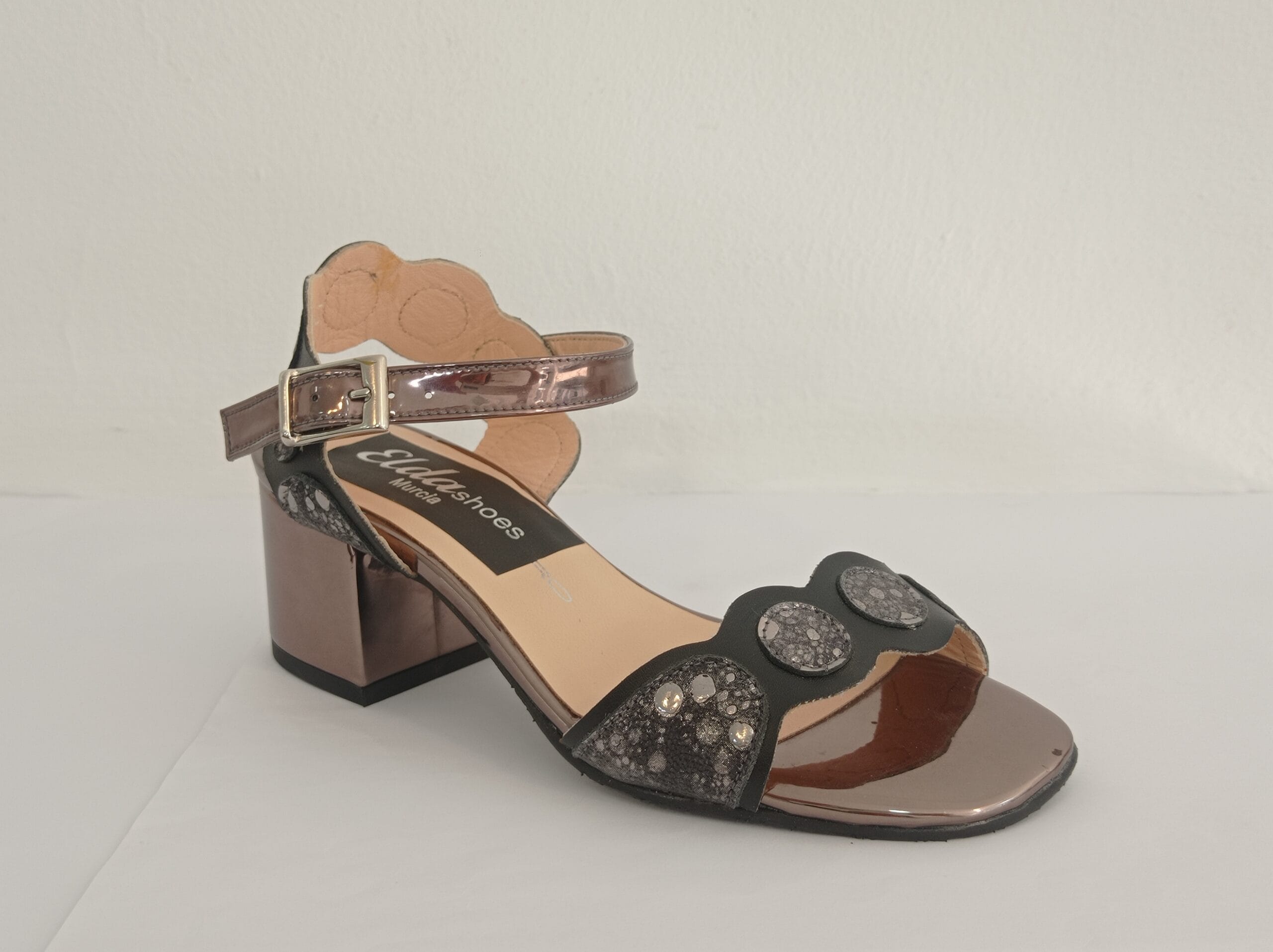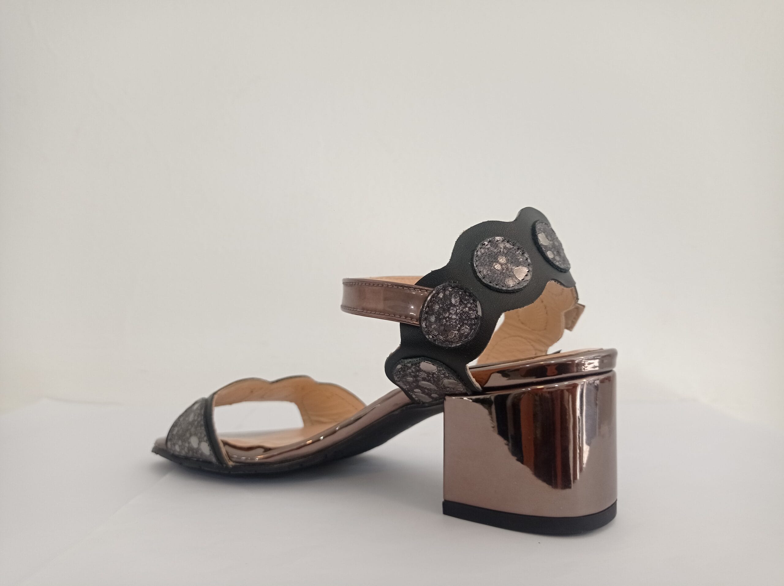 SANDALIA DE TACON CUBANO CON ADORNO DE CIRCULOS EN PIEL PLATA VIEJA .