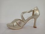 SANDALIA DE TIRAS CRUZDAS EN LA PALA Y EN EL EMPEINE EN PIEL DORADA CON PLATAFORMA Y TACON ACARRUCHADO.