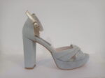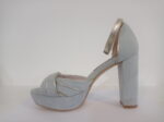SANDALIA CON TIRAS ENTRELAZADAS CON TALON CERRADO EN ANTE AZUL BEBE Y FILOS Y PULSERA EN PIEL DORADA CON TACON GORDO Y PLATAFORMA