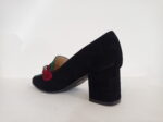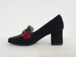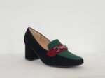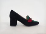 MOCASÍN DE ANTE NEGRO, BURDEOS Y VERDE CON HERRAJE METÁLICO, SUELA DE GOMA.