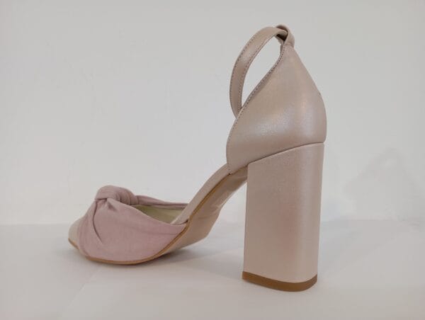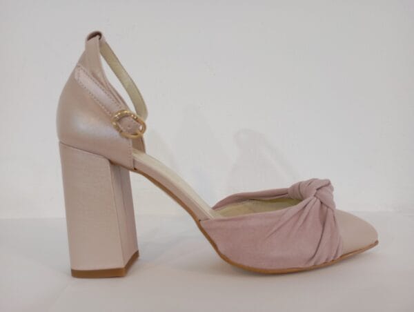 ZAPATO DE PUNTA FINA CON PULSERA AL TOBILLO EN NACAR ROSADO Y ADORNO DE NUDO EN ANTE AL TONO CON PLATAFORMA INTERIOR Y TACON GORDO.