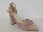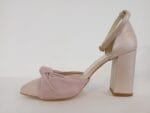 ZAPATO DE PUNTA FINA CON PULSERA AL TOBILLO EN NACAR ROSADO Y ADORNO DE NUDO EN ANTE AL TONO CON PLATAFORMA INTERIOR Y TACON GORDO.
