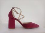 ZAPATO CRUZADO EN TERCIOPELO BURDEOS CON TIRAS CRUZADAS EN METAL DORADO Y TACON GORDO.