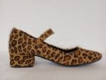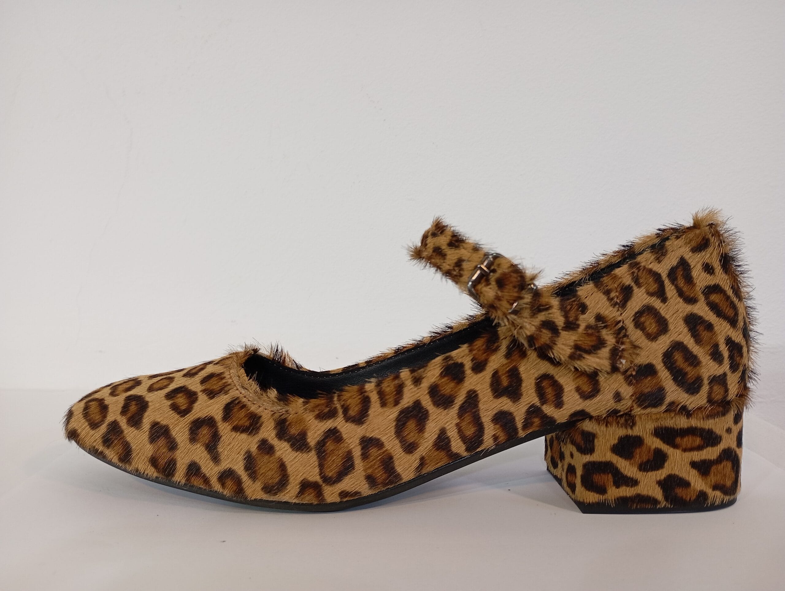 ZAPATO TIPO MERCEDITAS CON HEBILLA EN PELO DE LEOPARDO Y TACON CUBANO BAJO.