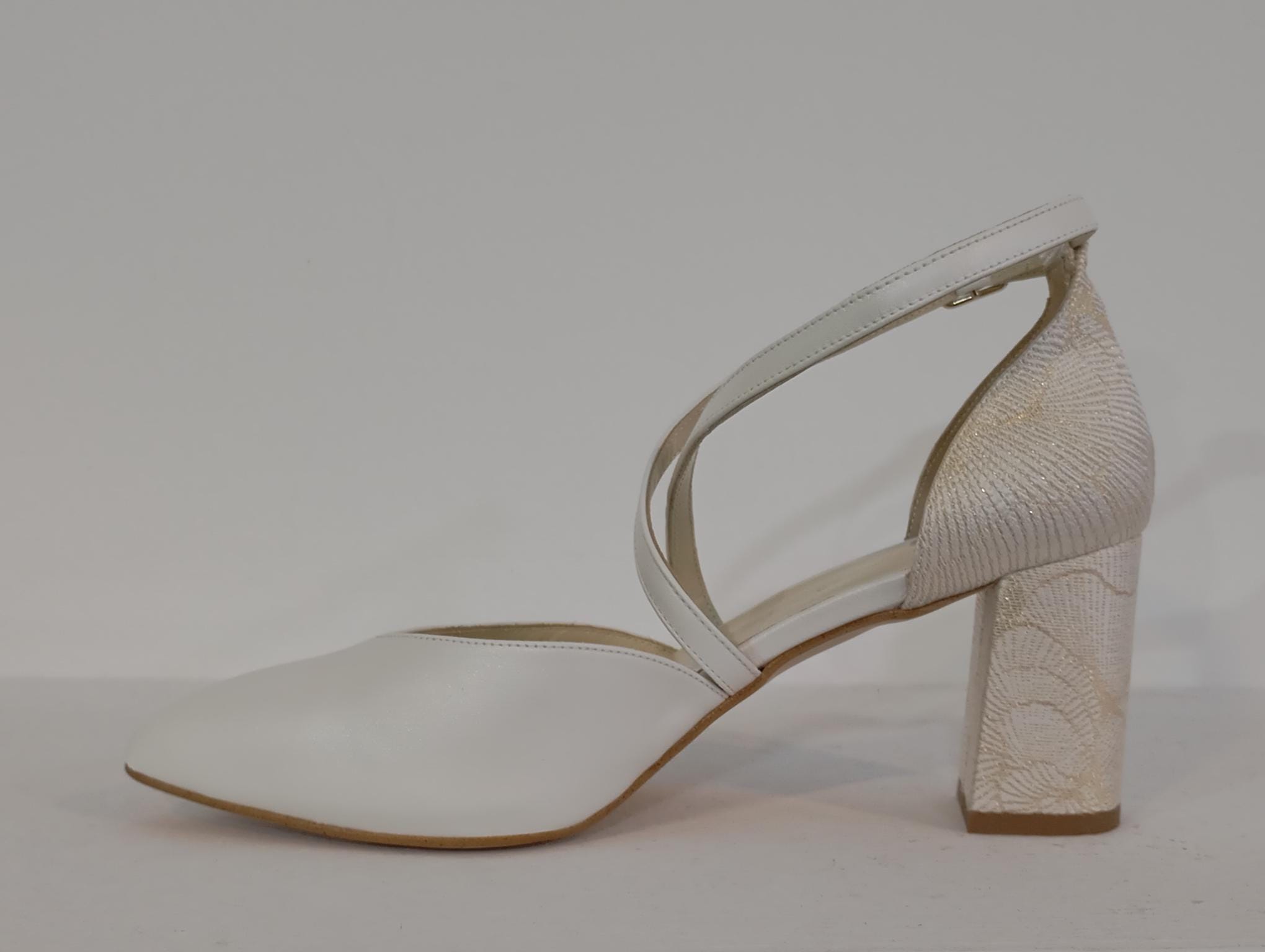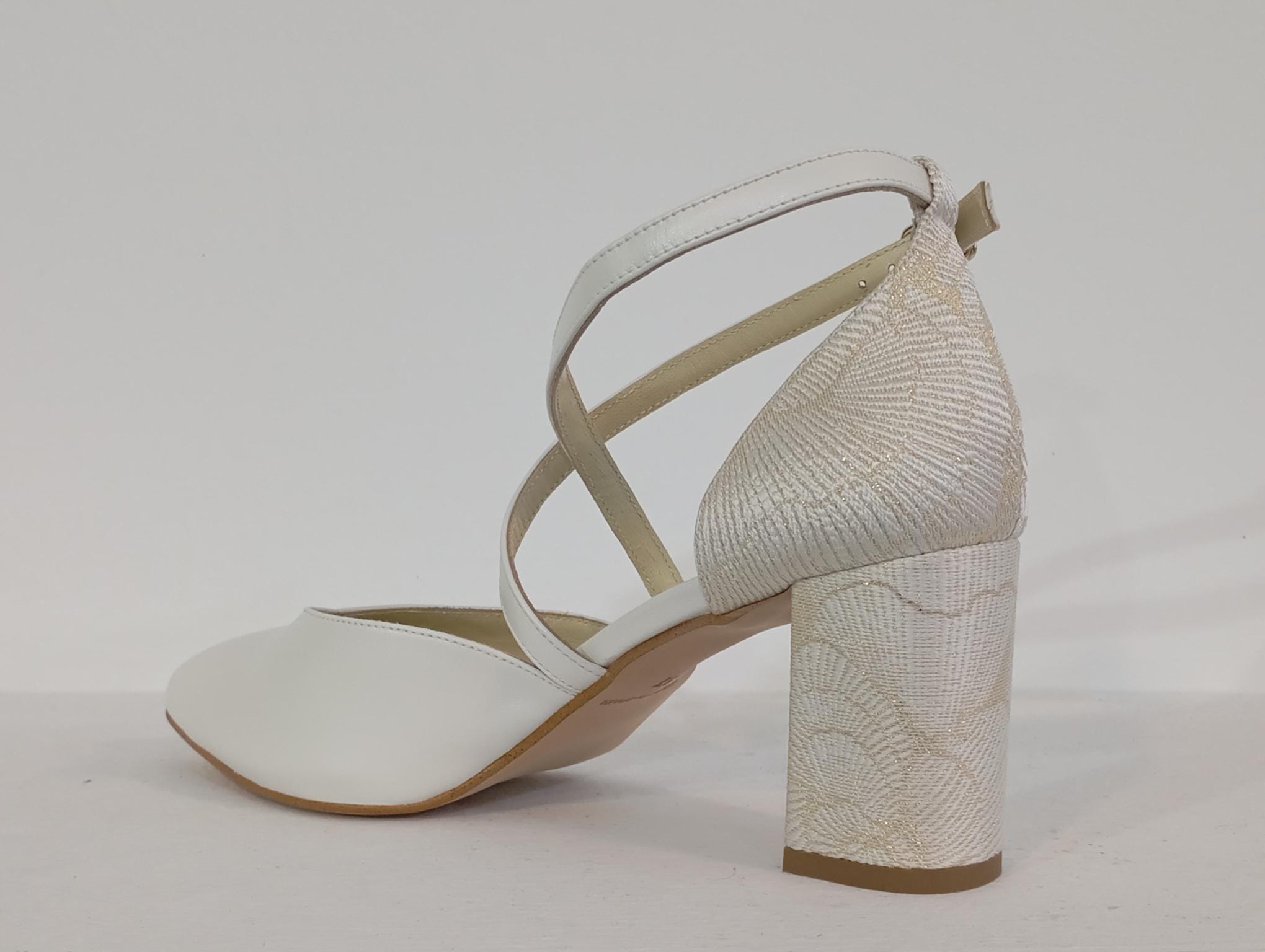 ZAPATO TIRAS CRUZADAS CON PLATAFORMA INTERIOR EN NACAR NOVIA CON TALON Y TACON EN TEJIDO DECORADO EN BLANCO Y CHAMPAN CON TACON GORDO .