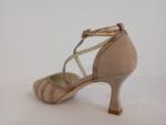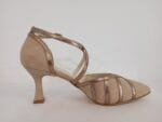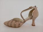 ZAPATO DE TIRAS CRUZADAS EN ANTE CAMELLO CON TIRAS EN LA PALA Y EN EL EMPEINE EN METAL AL TONO CON TACON DE CARRUCHA .