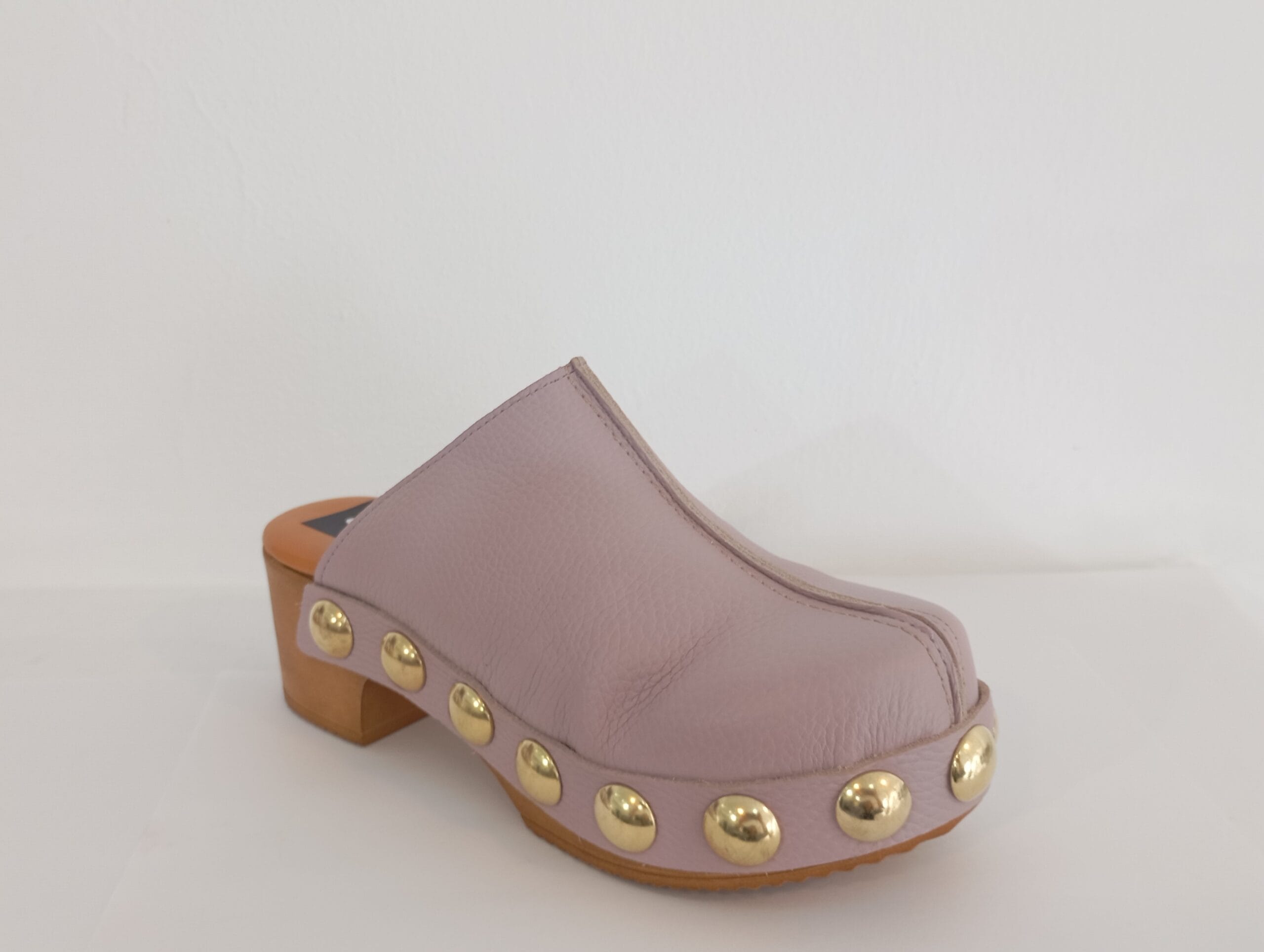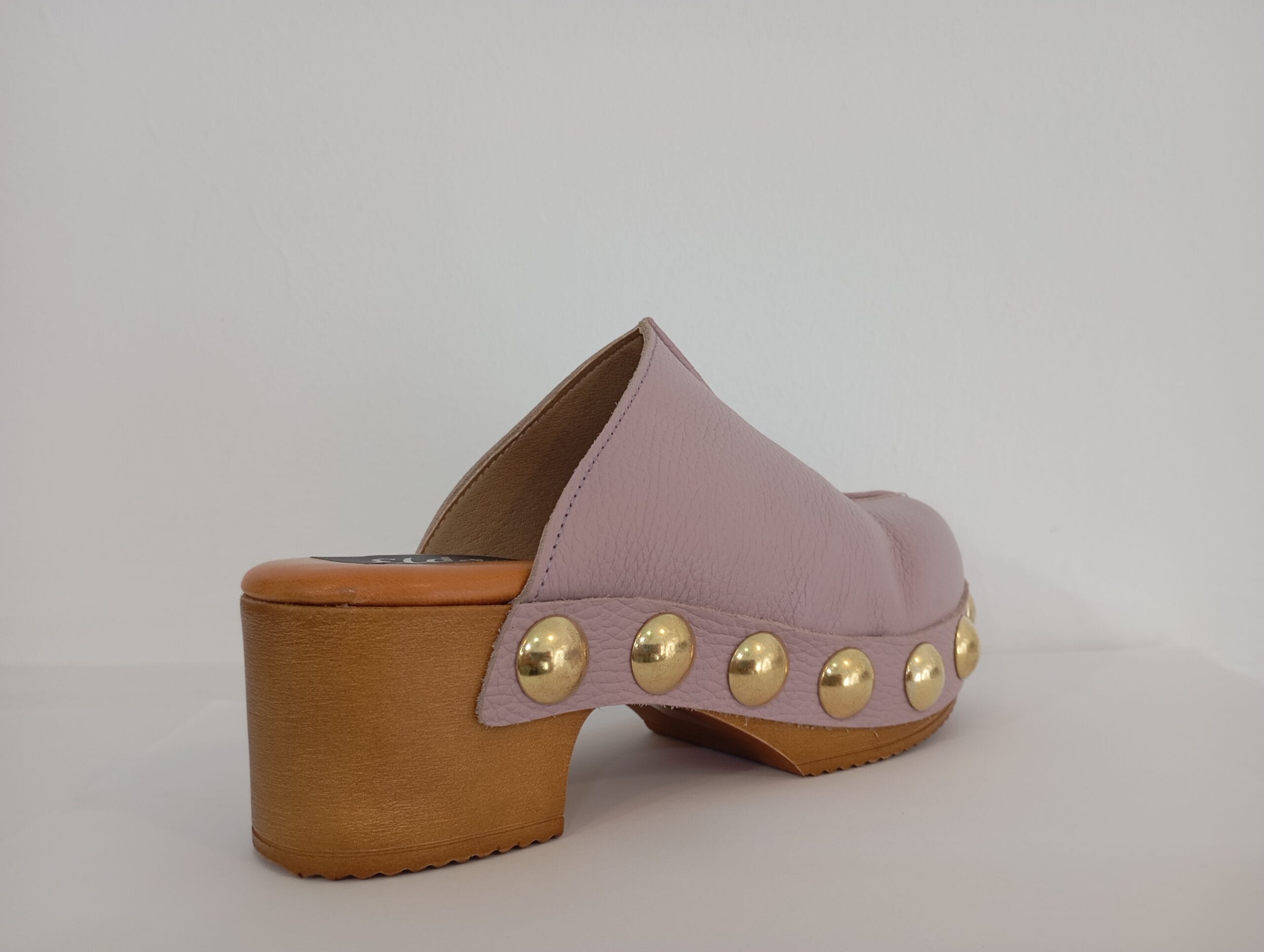 ZUECO EN PIEL MALVA CON TACHUELAS DORADAS Y PLANTA DE GEL .
